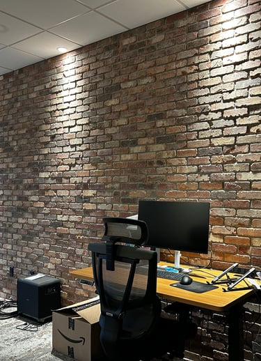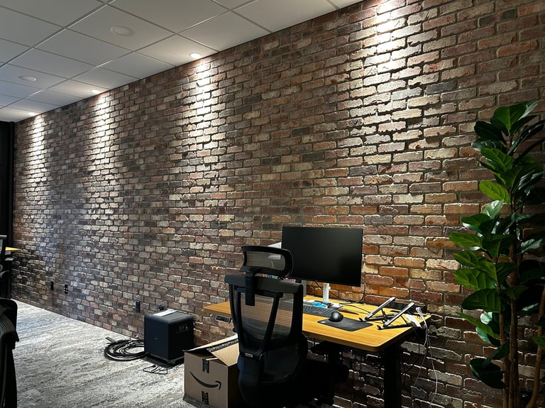 For Drumeo, a renowned drum school, we crafted this striking brick accent wall to elevate their studio’s aesthetic. Using Hebron Brick Bell Tower, we achieved a timeless industrial look that blends seamlessly with the modern workspace. The carefully laid brickwork provides texture and warmth, while integrated lighting highlights the rich tones and natural variations of the brick.